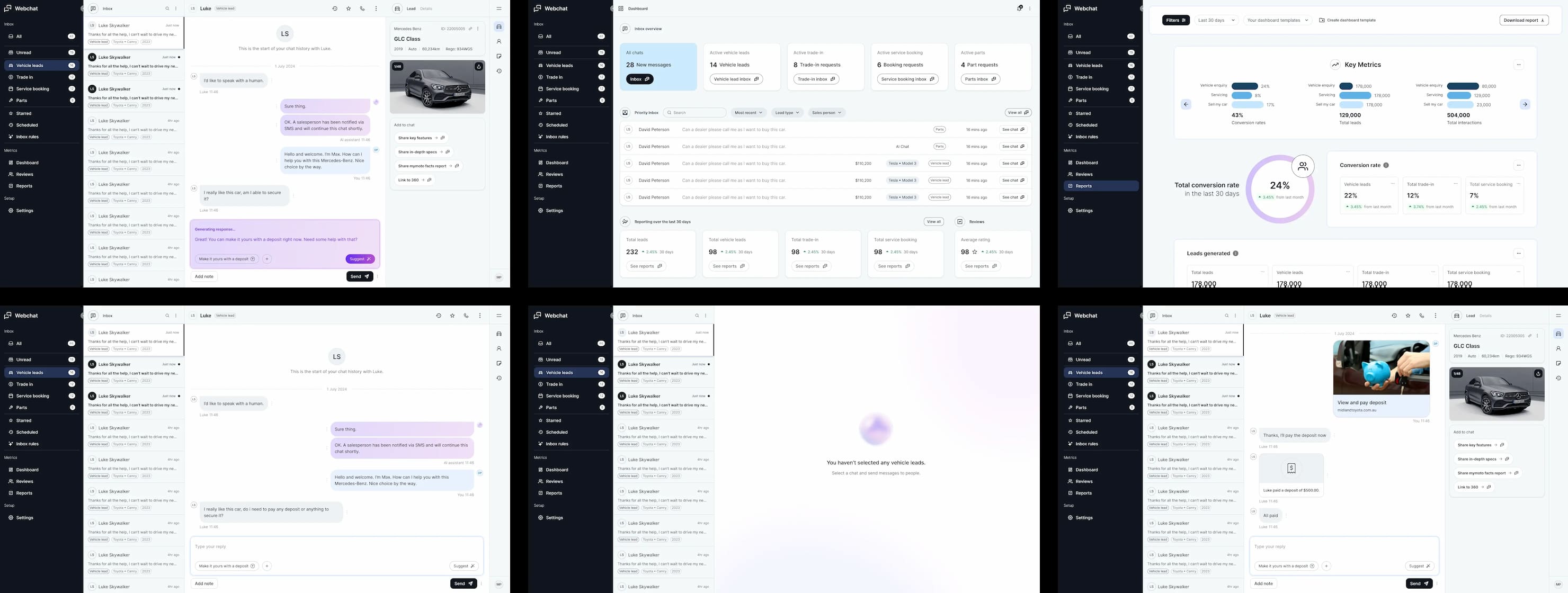 I created polished UI designs that balanced modern aesthetics with clear functionality. This included layouts for the inbox, chat panel, reporting dashboards, vehicle cards, and customisation tools. Interactive prototypes were built to validate flows like sending a suggested message, sorting chats, or switching between categories. These prototypes helped stakeholders and developers visualise the product experience before build, reducing misunderstandings and revisions.